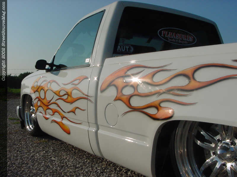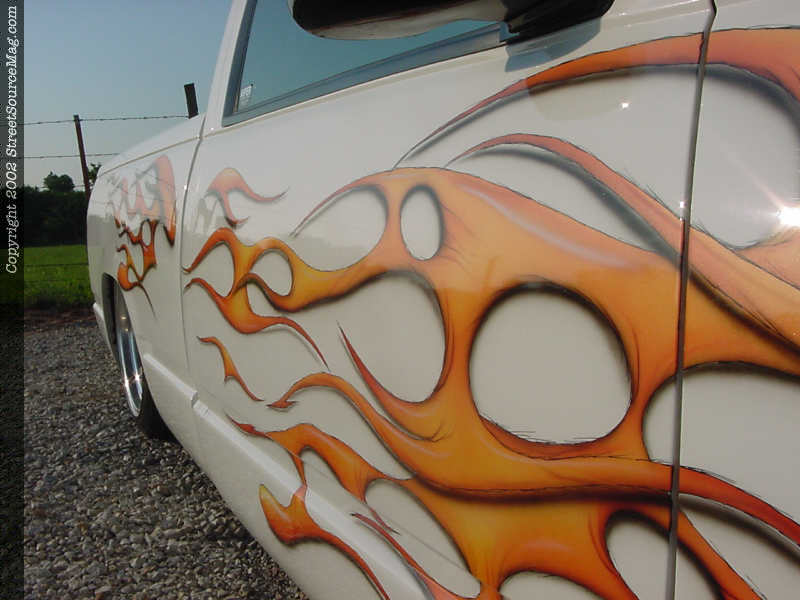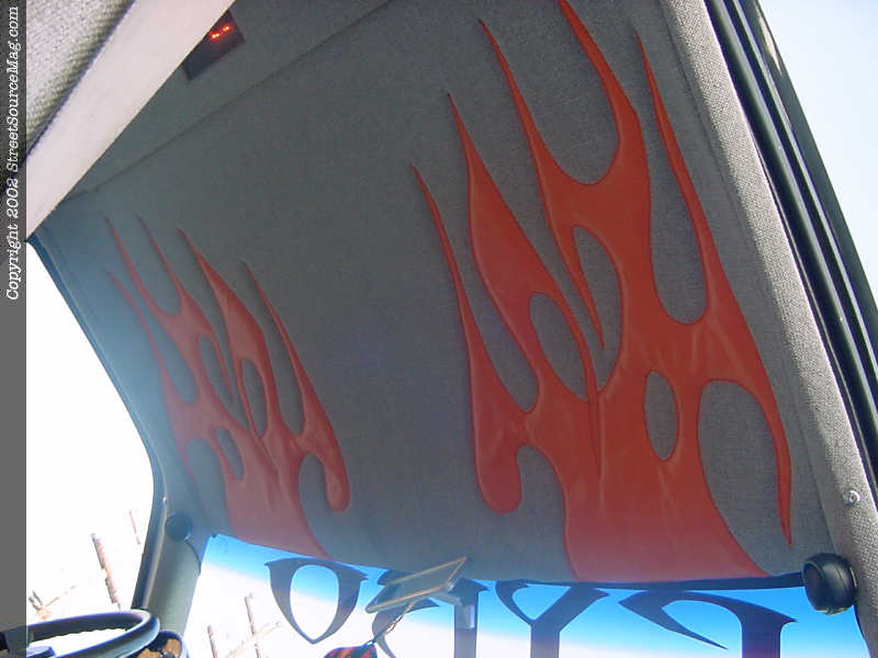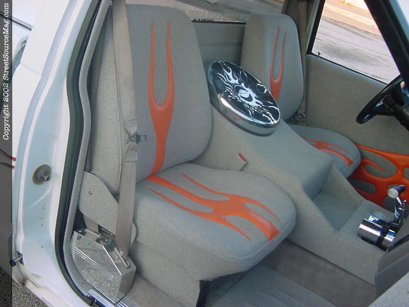 Moving to the interior Allan had Todd Haygood at Upholstery Unlimited in Oklahoma City work his magic. Todd junked the factory seats for a set of Dodge Charger wrapped in gray tweed with orange vinyl flames. With the interior concept already on the seats Todd kept it flowing with the doors and the headliner matching the seats.