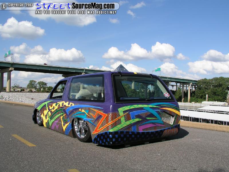 With all the body mods complete William went back over the truck priming and blocking it until every imperfection was removed and the shiny stuff could be applied. House of Colors purple was then spayed onto the smoothed firewall, the underside of the cab and the entire body of the lil Blazer. This is were the majority of people would have quite and called it done but there was no way that was going to happen so William added a combination of diamond plate, cheddar cheese, flames, slash and alien skin graphics in a variety of hues from HOK that flowed from the body on thru the door jams.