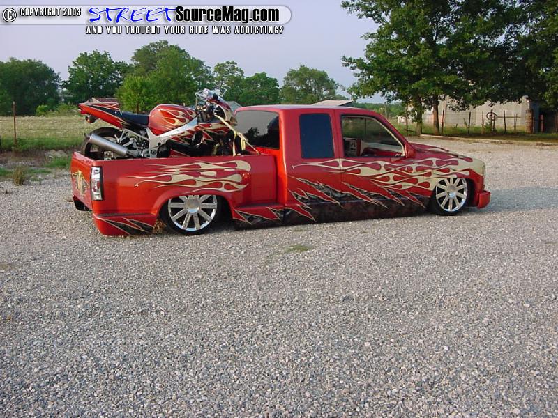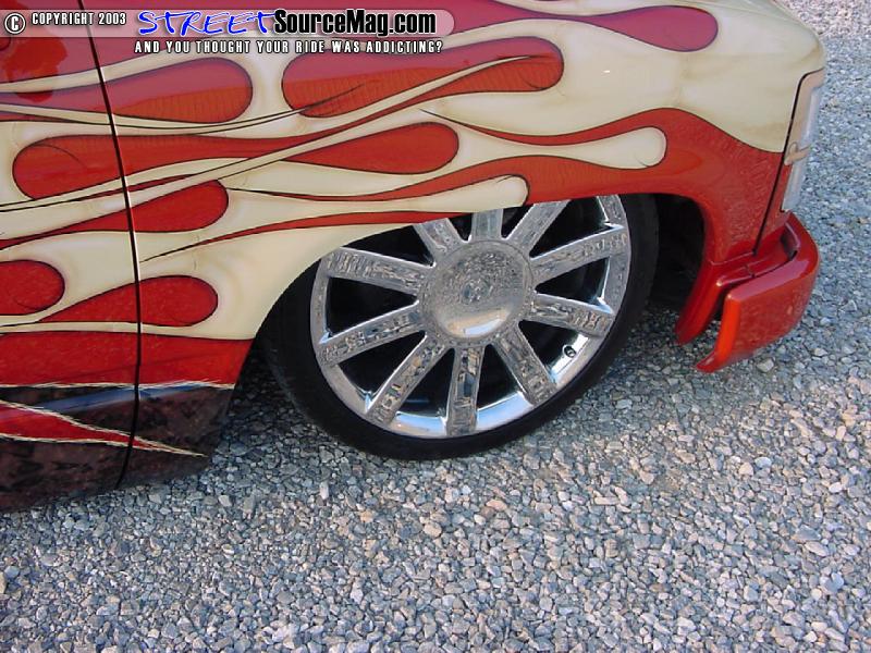 As for the suspension Brian junked all the factory springs and spindles. Up front replacing the coils is a set of firestone airbags with a relocated shock. To get that extra drop up front 2" drop spindles were put in place of the junked stock spindles. Out back Brian went with a four link for a smoother ride and hella lift. Getting the rear up and down a matching set of airbags was installed. Rolling stock for this flamed out Chevy consist of 20" KMC wheels wrapped in 255/35/20 Nitto tires.