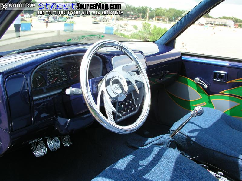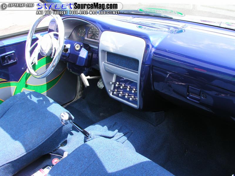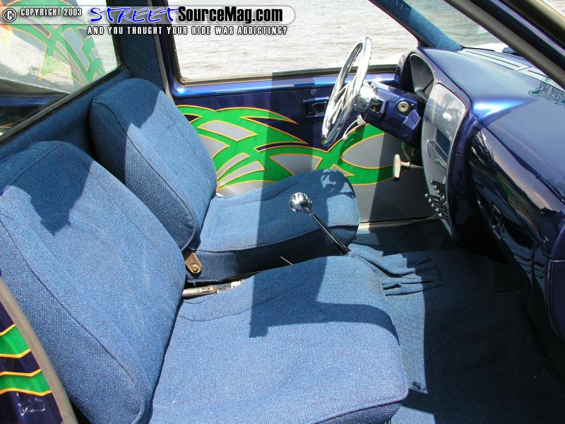 Wanting the graphics scheme to flow into the interior Chad's Dad cut custom metal door panels and then treated them to the same matching graphics designs that adorn the exterior. Once the dash and door panels were in place a Colorado Customs Wild Horse billet steering wheel was installed. The factory bench seat was replaced with donors from a Pathfinder but only without the headrest. Juan's Upholstery in Pearl, MS then covered the seats and floor with Sherpia Blue tweed.