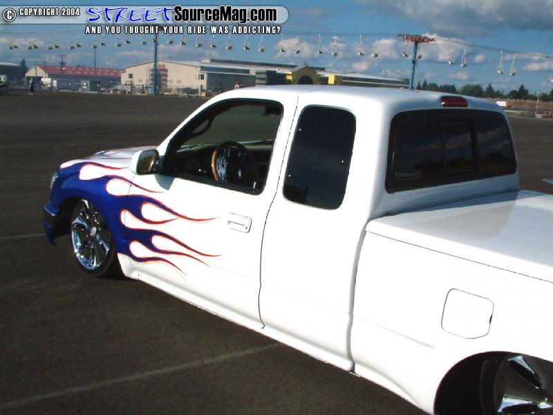 To finish up the bling Oliver would install a billet antenna along with a Snug Top tonnaeu cover. Scott at Drew Bros. Customs of chandler, AZ would be responsible for the body modifications. Once the bodywork was straight and the base white was re sprayed Oliver would have a set of Corvette blue flames pinstriped in orange.