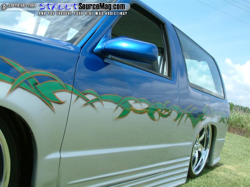 The front bumper would be fiberglassed along with a fiberglass roll pan molded to the Blazer body. Moving on with the modifications the door handles would be shaved along with the gas filler door, which would be relocated into the factory jack location. The headlights would be recessed 2” and the taillights would be shaved and replaced with a set of ’91 Cadillac lights.