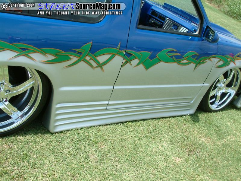 The body lines, emblems, antenna, wipers, tailgate handle and roof rack would all be shaved while a set of ground effects would be molded to the body. Flush mount LED’s would be installed for turn signals in the front bumper while a 67”x40” Street Beat sliding ragtop occupies the roof. Brian with help from Jay Lucey would take on all of the bodywork.
