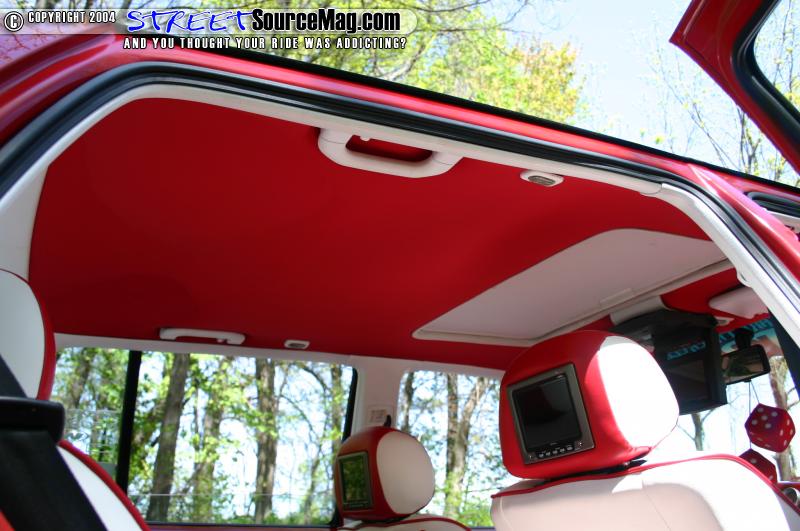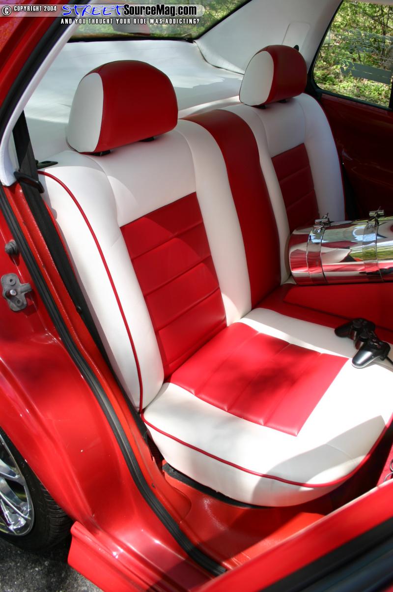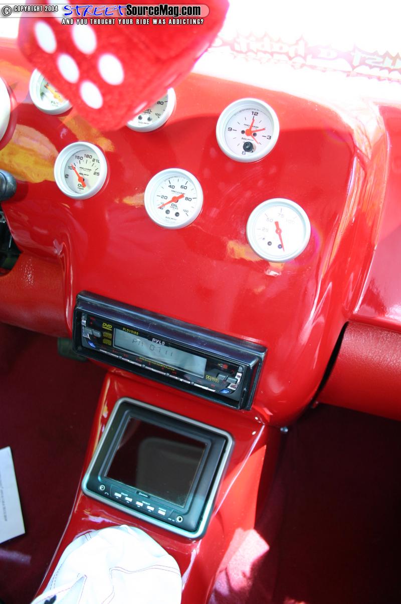 The interior of the car features two-tone leather seats in red/white. The headrests are fitted with TV’s. The roof is also wrapped. The dash was fiber glassed and Stewart Warner gauges were mounted in it. A TV was also fitted into the passenger side of the dash. A steering wheel was bolted up with a red leather trim. The trunk features a fiberglass enclosure with subs in it.