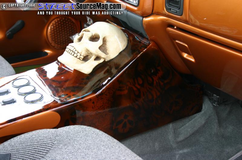 The interior features a painted dash, and painted door panels. The center console was smoothed and painted and the seats were swapped out for a set out of a 1997 S-10. Custom SS vents by CMC Metals were installed in the dash, along with a Trenz Billet mirror, and a Colorado Customs Steering wheel. The dash also houses the Pioneer CD player. Tom’s stereo consists of JL Components, a JL 10” sub, and JL Amp.