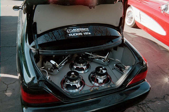 42 inch plasma in back seat, where back seat used to be, 3 12 inch eclipse chrome subwoofers, 2 arc audio amps. 2 tvs in visors, 2 tvs in trunk, fiberglassesd with mids and tweets, all done by me. 9 tvs total in car. taking out all tvs, there a waste dont watch them in the car anyways, just there for show. time to use them at the house.