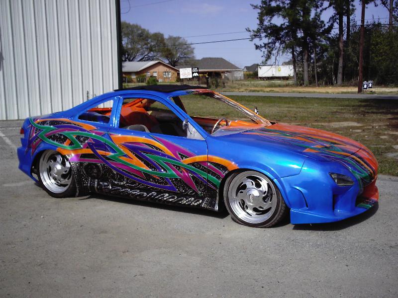 custom fender flares to tuck 20x8 in the rear, motorcycle headlight conversion, motorcycle gas cap, prelude tails, shaved out, sliding ragtop, side skirts molded into one piece. Chaotic Customs 281-290-6000