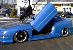 Laguna Seca Blue from a 02-03 BMW M3,shaved door handles,emblems,side moldings,keyholes,and power antenna.Full body kit Extreme front bumper,Bomex sides,Bomex Rear,Black widow spoiler,Slk dual LED mirrors,black housing alteeza tail lights,dual black housing projector halos,black bumper lenses,Hanabi H.I.D's,BMW roadster fenders.