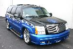 PS2 in passenger airbag, custom bezel holding in a 8" pioneer monitor and center channel, AC controls relocated to ash tray compartment, waterjet cut speaker covers for front kick pods, "escalade" cut out of plexiglass over amp rack. Speaker enclosure is mirrored inside with Street Glow blue neon. XBox in center row, 4 player adapter for PS2 mounted into center console 12v compartment. TV tuner, 12 disc changer, elctronic and neon switches all located inside the center console.