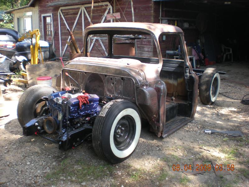 Find a fleet side bed. Probably some kind of dark blue suede paint. Smallblock 350 or Inline 6, Vintage Air, Solid side windows.