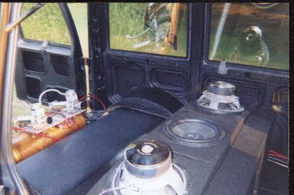 Clarion head unit, Diamond M36.6 mids powered by a fosgate 150w amp, 3 Diamond M6 12's powered by a 1200w Diamond amp, 1 farad cap, and a optima yellow top battery
