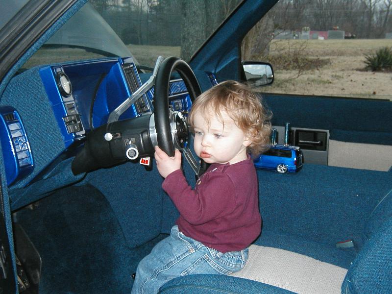 everything tweeded or painted. Tweed is navy blue and beige. The headliner and door panels have flames.