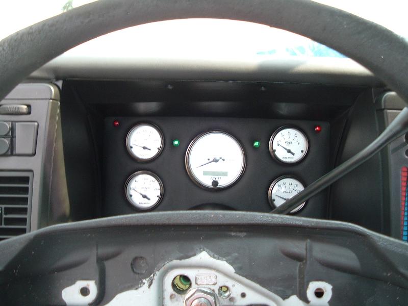 autometer american platinum gauges with the black bezels, custom shaved dash wrapped in plush fake leather, leather power seats out of something, custom door panels, everything custom wrapped