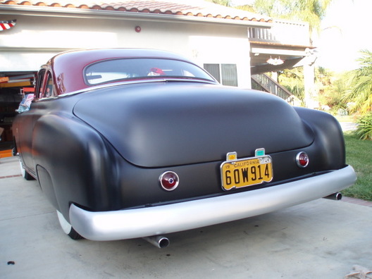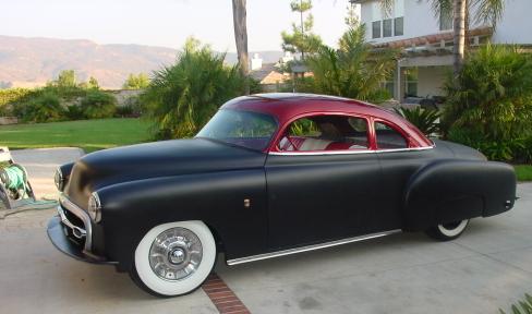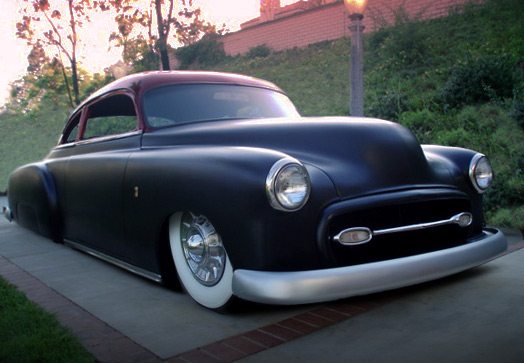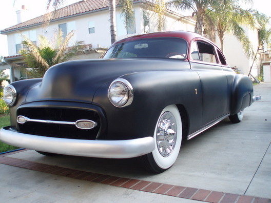 Shaved: door handles, hood, trunk. roof chopped 3 1/4". roof painted with HoK Orion Silver base and topped with Kandy Apple Red. the body was painted with a black basecoat and flexed clear. hand-fabbed grill shell with a '55 Chrysler grill bar. ~SOLD~