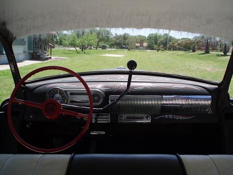 Custom red and black flaked Door panels, new black and white bench seats, new long white angel hair furry headliner, new carpet, flat black dash with pin stripes, custom black flaked three on tree shifter. Steering wheel matches roof. everything works but a/c and radio.