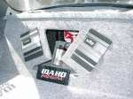 2 12" Rockford Power DVC subs, 2 600 watt Alpine V12 amps, 1 farad red rockford Cap, and .5 farad rockford silver cap. 2 guage wire. Infinity Kappa mids/highs. Kenwood Headunit, Pioneer Eq