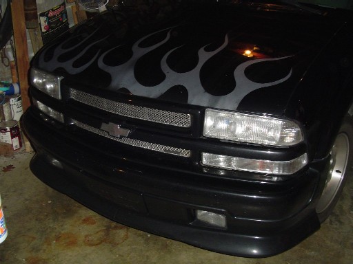 shaved door handles, shaved rear wiper, shaved xtreme emblems, roll pan, grillcraft grill, new headlights and corners, primer flames for now until the new hood.
