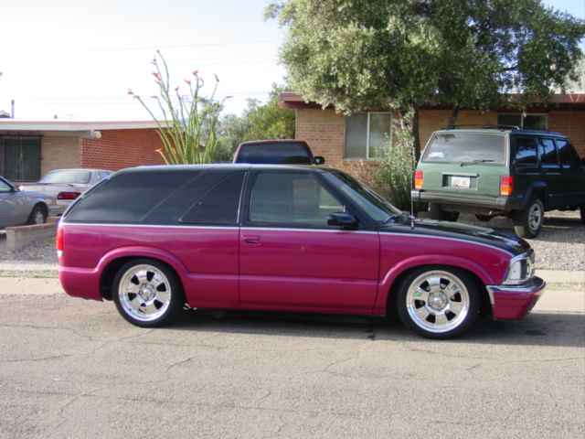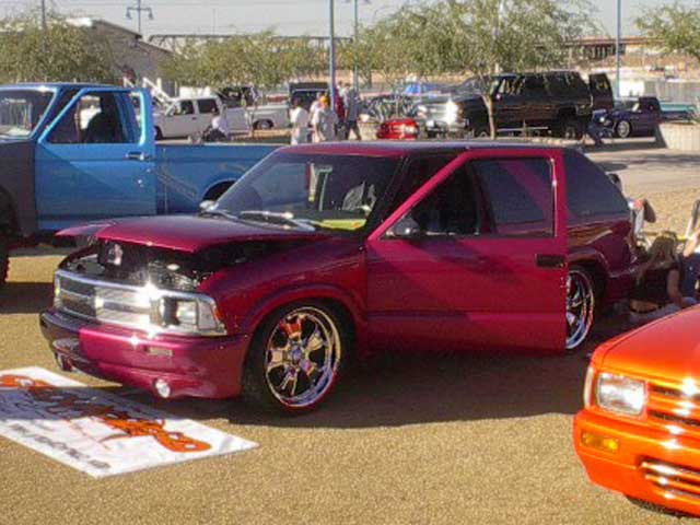 98 Chrome blazer LS bumper,Billet Specalties wipers,Trenz billet antenna, Trenz billet Lic. plate cover,Street Scene Mirrors, Custom roll pan, shaved roof rack,Trendz Billet Inserts and Bowtie,clear corners,All emblems Shaved,Street Scene smooth cowl,H-4 diamond crystal headlight conversion,old school clear tails(instead of damn altezzas), 2 tone paint job black and rasberry metallic, done by Fat Paul at Murals'N'More.