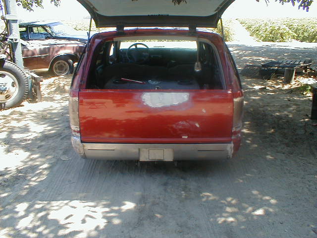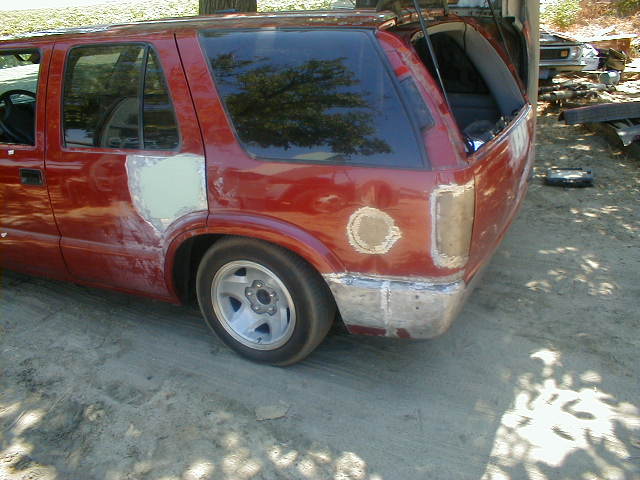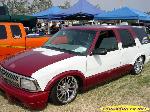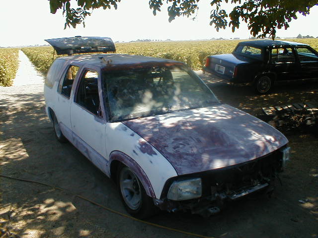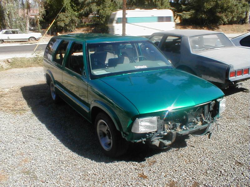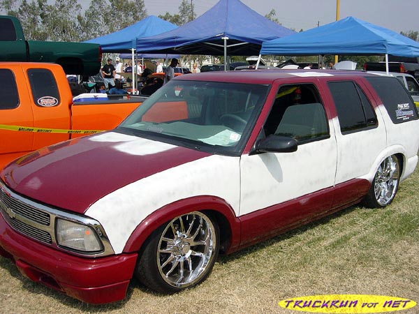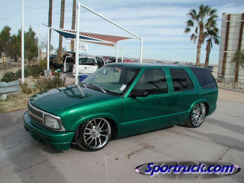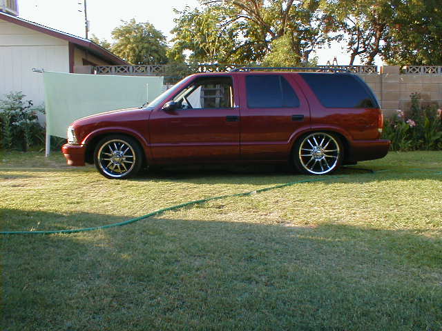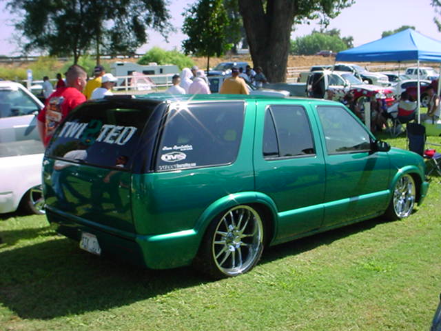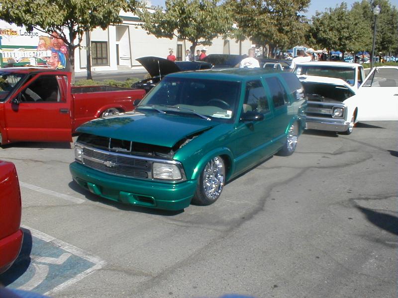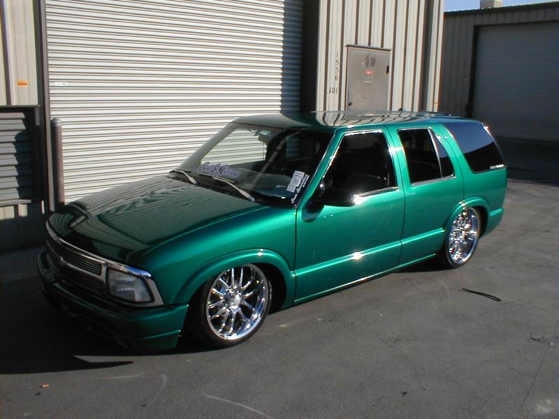shaved door handles,antenna,hood squirters,gas door,tailights,rear wiper,rear lock,roof rack,(basically everything that wasn't needed)removed rear bumper and added an F.B.I. S-10 rollpan with LED tailights. Thanks to Central Valley Customs(559)287-6380 for the paint and bodywork.98 s-10 front bumper, billet grille,door poppers installed by Autotronix(now AVS), just installed 12 channel remote box to open doors and can control airbags with remote, and airhorn.