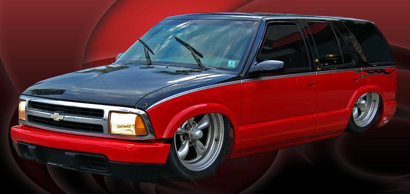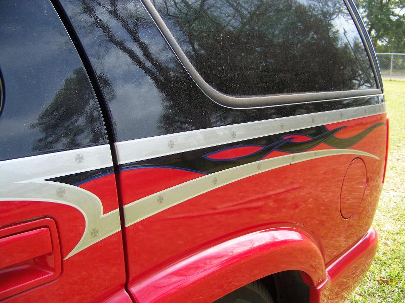 custom two tone red and blac with simulated brushed aluminum seperating the two and some flame detail on the rear.