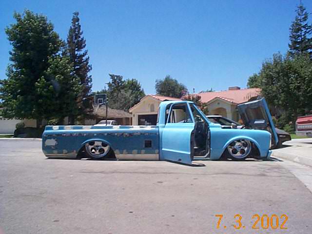 shaved handles, gas filler, cowl vents, side markers, antennae frenched into back of cab,shaved tailights, tailgate handle and leds between tailgate and rollpan