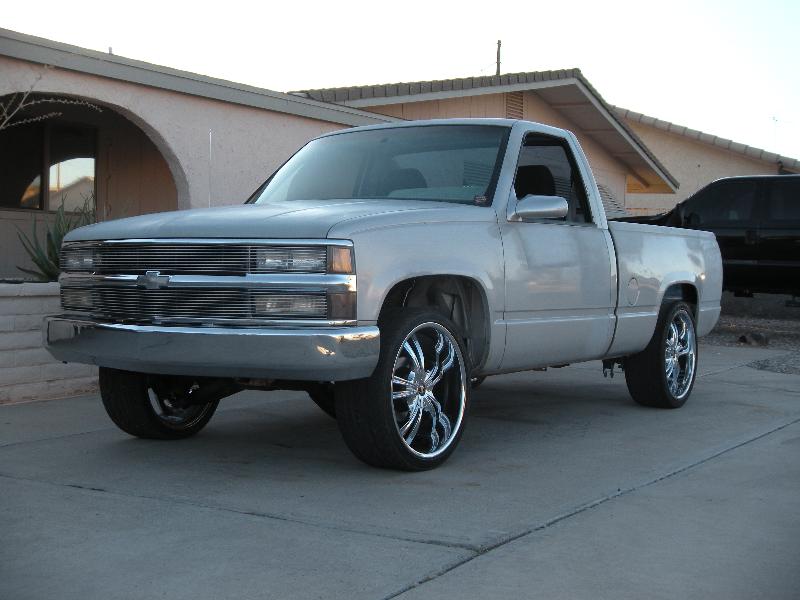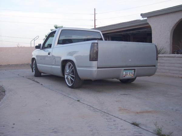 Shaved handles, shaved tailgate, roll pan, phantom grill with smoothie Chrome bumper. Caddy tail lights. Shaved fuel door.