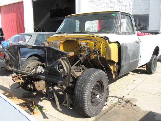 '67 clip w/ '69 hood, baby blue paint, custom tube chassis, BonSpeed Malibu's, Lincoln Interior, sheet metal bed.