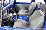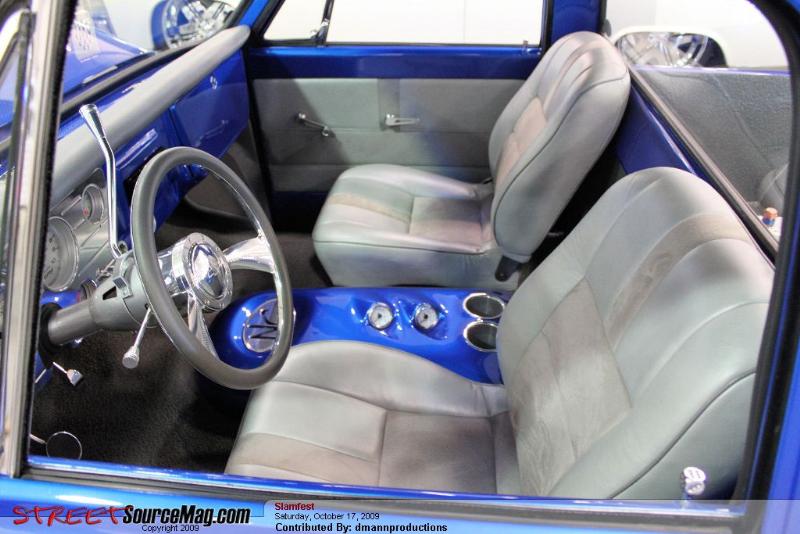 03/07/2009 All Metal was inside was painted House of Kolor True Blue Pearl. Two Tone Headline painted Gun metal Metallic. Modified '97 Nissan Hardbody bucket seats /Silver leather and suede for the seats and door panels. Smoothed and painted dash. Billet Specialties Hustler steering wheel and Billet window and door handles, along with a custom fiberglass center console