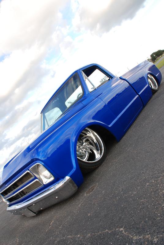 03/07/2009 fixed all body work and repainted House Of Kolor True Blue Pearl..... Shaved door and tailgate handles, cowl vent, gas hole, driprail, taillights, antenna, and front turn signals / frenched license plate box, molded tailgate,Hitech Led tail lights, tubbed rear fenderwells / radiused bed corners / color-matched Line-X