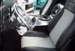 BLACK AND GREY TWEED INTERIOR. CAMARO BUCKET SEATS IN BLACK VINYL AND GREY TWEED W/FLAMES. ALL POLISHED ACCESSORIES. FULLY POLISHED COLORADO CUSTOMS FLAMED STEERING WHEEL. CUSTOM PAINT MATCHED FIBERGLASS CENTER CONSOLE HOUSING 3 JL 10'S.
