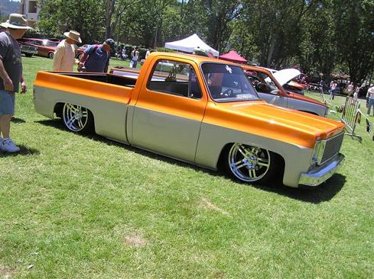 fully shaved.paint is hok sunset pearl on top with 2 coats of orange pearl.the bottom is frost beige with 4 coats of orange pearl.All covered with 6 coats of house of kolor uc-35 clear.paintwork done by me at my friends bodyshop.just got pinstriped flames along bottom of truck and wrapped around rollpan with striping on center of tailgate.clear leds in rollpan. precisionrodware.com