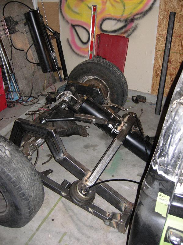tubular upper and lower front control arms , 2.5 inch drop spindle, the rear is in progress, custon 2x4 steel tubing frame with a custom built superpivot rear suspension