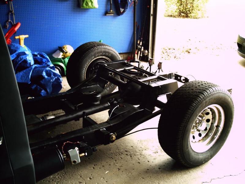 slam bags all around, tri-angulated 4-link(bags on lower bars), 2" drop spindles up front, two 5 gal tanks with three vair compressors, 3/8 line, digital air ride set up and valves