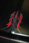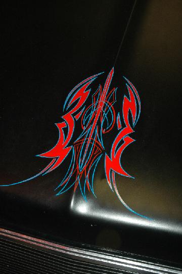 black loop cut carpet, stock door panels with armrest cutoff and recovered in red and black with tribal design in lower part. matches design on tailgate