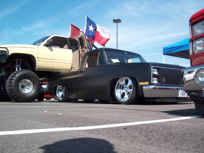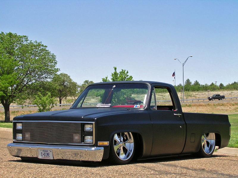 shaved stake pockets, drip rails, cab seams, and mirrors. satin black paint, roll pan with a crooked ass plate. moved the bed up closer to the cab about an inch. pinstriping on hood, tailgate, and radiator support