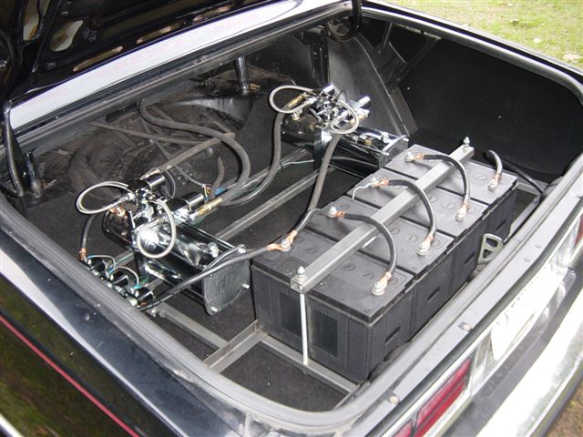 2 pump prohopper setup ,4 batteries,3 1/2 ton coils, 8 and 10 inch cylinders, power balls in the rear.battery rack welded to frame.rack is set up for 3 pumps and 6 batteries.