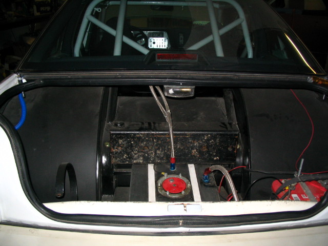 blue interior with white funny car roll cage, and racing bucket seats