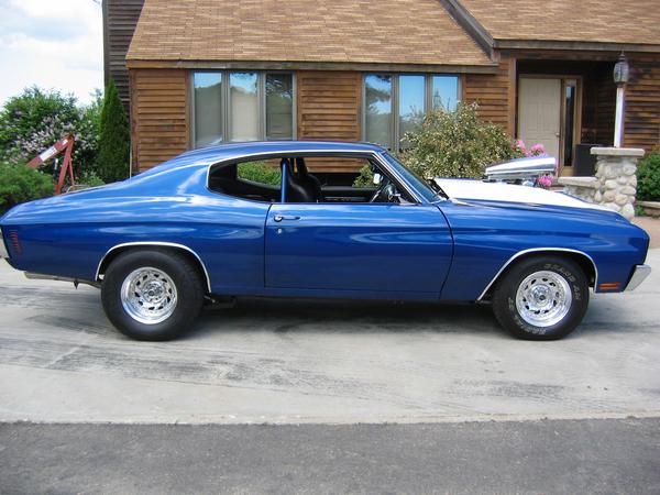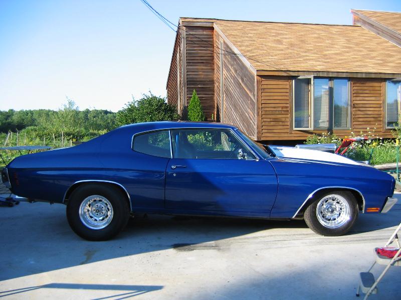 Painted electron blue, all new bumpers, chrome trim, stainless steel brakes lines, repainted frame, and underbody, 4" fibergalss cowl induction hood, custom emblems