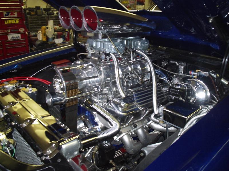Merlin stage 1 572 Big Block with a Weiand 8-71 Blower, show quality polished nitrous system. Brodix BB2 Extra Aluminum firebreathing heads, JE 8.7:1 forced induction pistons, Eagle forged H-Beam connecting rods, Bullet custom blower camshaft, Comp Cams Pro Magnum roller rockers, comp cams pushrods, Jegs aluminum roller rocker stud girdel, dual Demon 850cfm 4-barrel blower carbs, pete jackson gear drive timing, CSI flexplate, CSI silver anodized electric water pump, custom headers, MSD 6BTM electronic ignition with MSD Blaster coil, MSD pro-billet distributor, aeromotive eliminator electric fuel pump, SSBC chrome brake booster with master cylinder, Strange solid spool 3.70 rear end