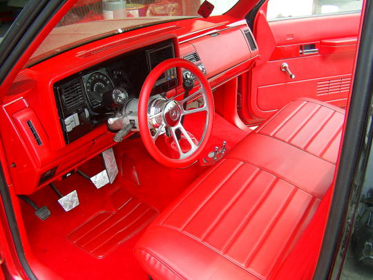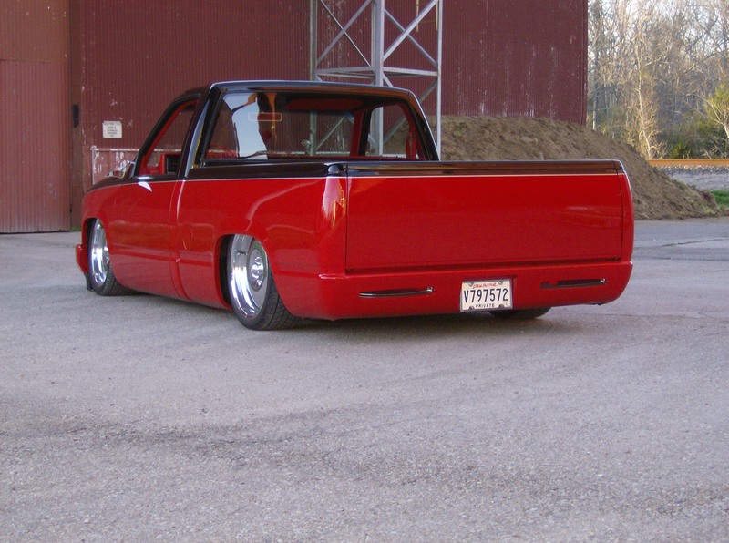 GMC full phantom,smoothe bumper,shaved tailgate,shaved doors, shaved antenna, shaved stake pockests, caddy lights in roll pan, two tone-Mercedes Black,torch red mixed around,shaved taillights, Front and back wheel tubs...