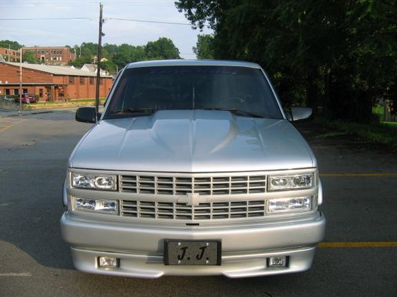 Galaxy Metallic Silver w/ Blue Vinyl Flames, Gen II Cowl Hood, custom headlights, markerlights, and turn sginals, custom front air dam, bed tarp, lund roll pan, and 15' pacer rims.