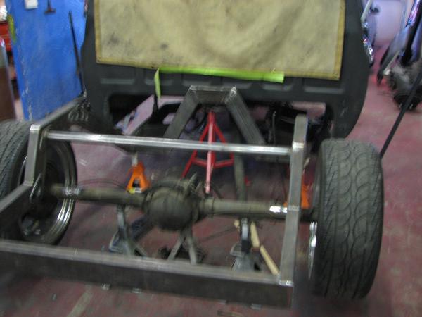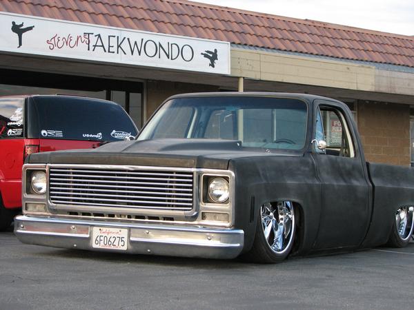 stock floored on 22s custom 3/4 frame, laying on stock control arms with drop spindles, contitech bags in front air lift dominators in the rear. custom tigged and built lower link bars. raised bed floor.