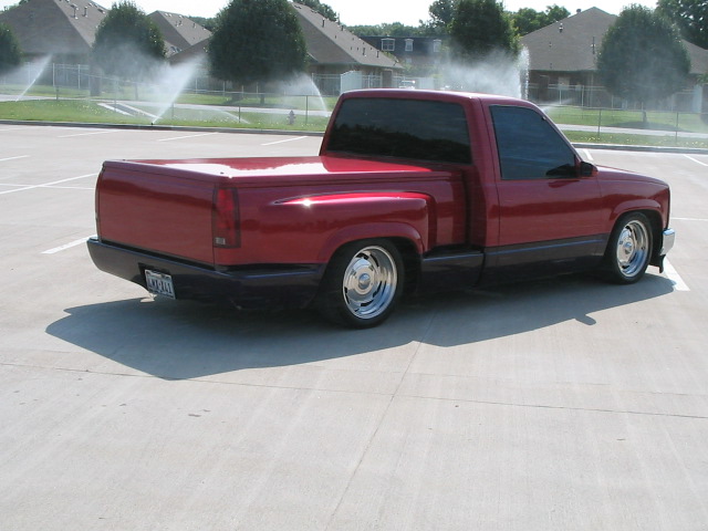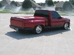 some primer spots now because some bitches like to do hit and runs and alcohol related incidents. oh well, that shit will buff out...paint: red pearl with purple and black marble bottom. shaved door handles, side markers, antenna,wiper cowl, tailgate,stake holes, molded rollpan, 98 gmc grill with Trenz billet, stylin concepts tear drop bumper, street scene sport mirrors, colonels bed cover, trenz billet license plate frame.
