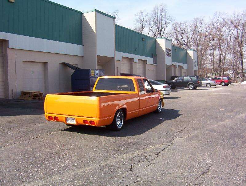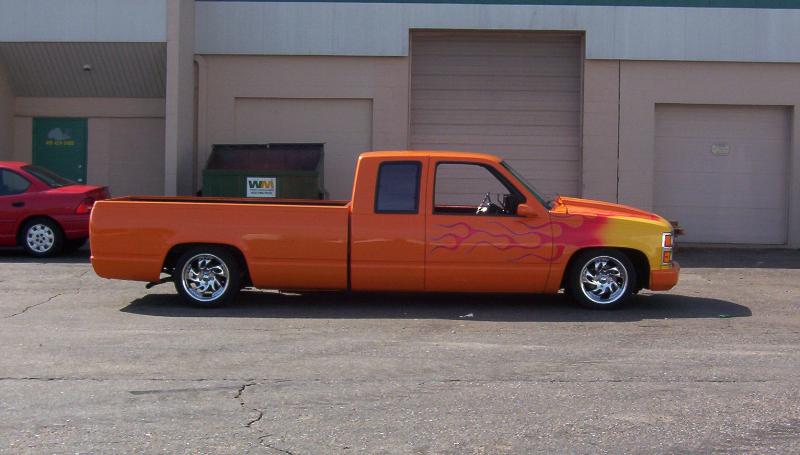 Clean and Shaved. Lowered 5/7". PPG Tangelo Orange with Custom Flames outlined in PPG Royal Blue.