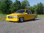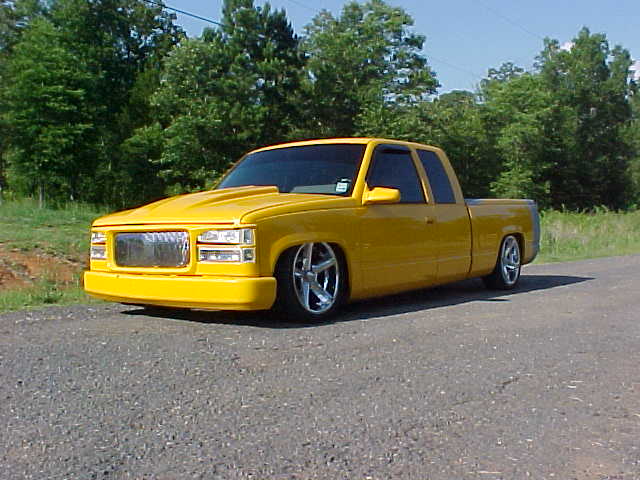 ppg chrome yellow with custom rock chips on bumper and grille and i got candy primer where the tail lights, roll pan, and stake pockets have been shaved, cat eye grille, speed grille insert, clears, projector beams, shaved tails and tailgate, LEDS