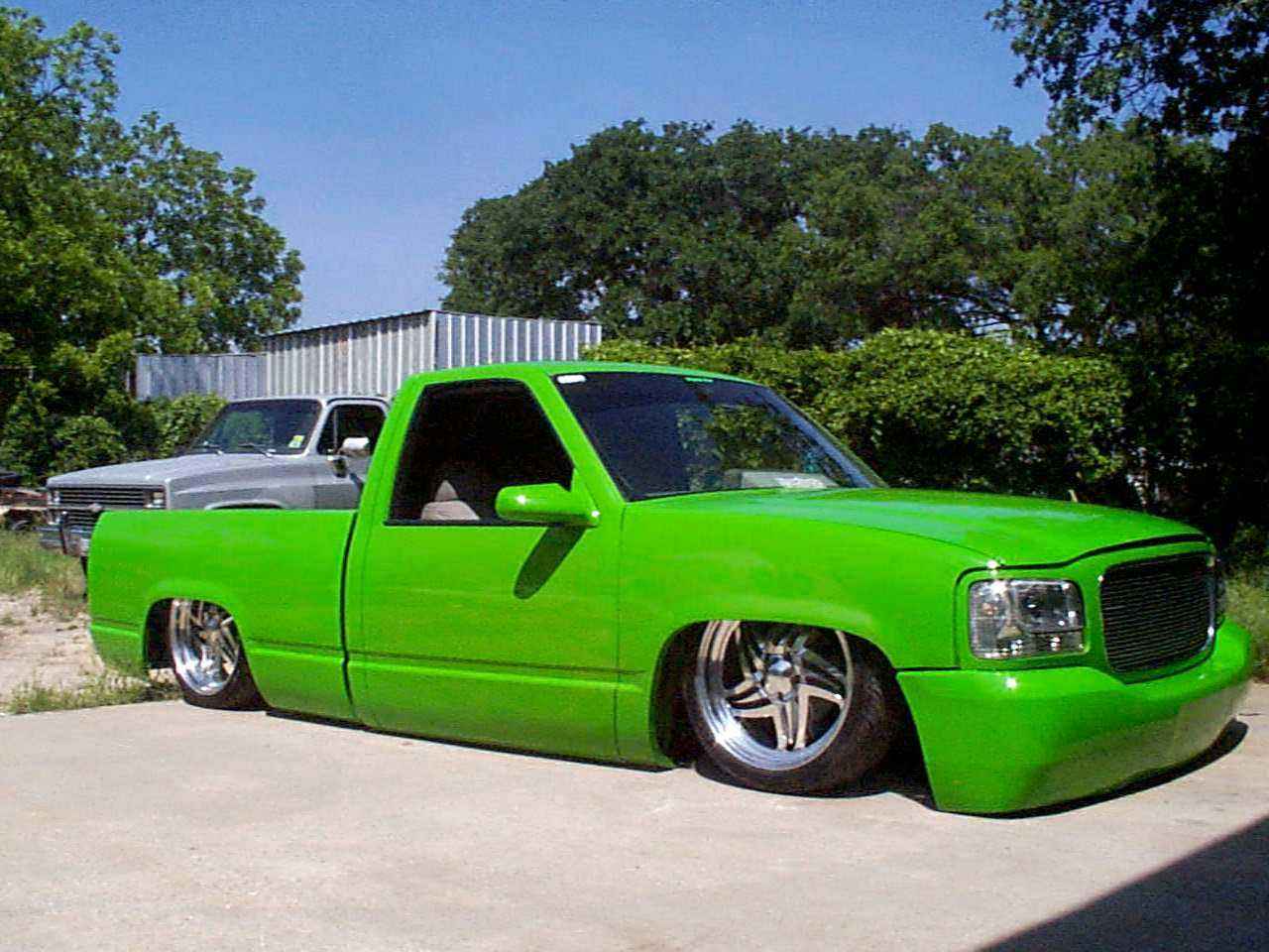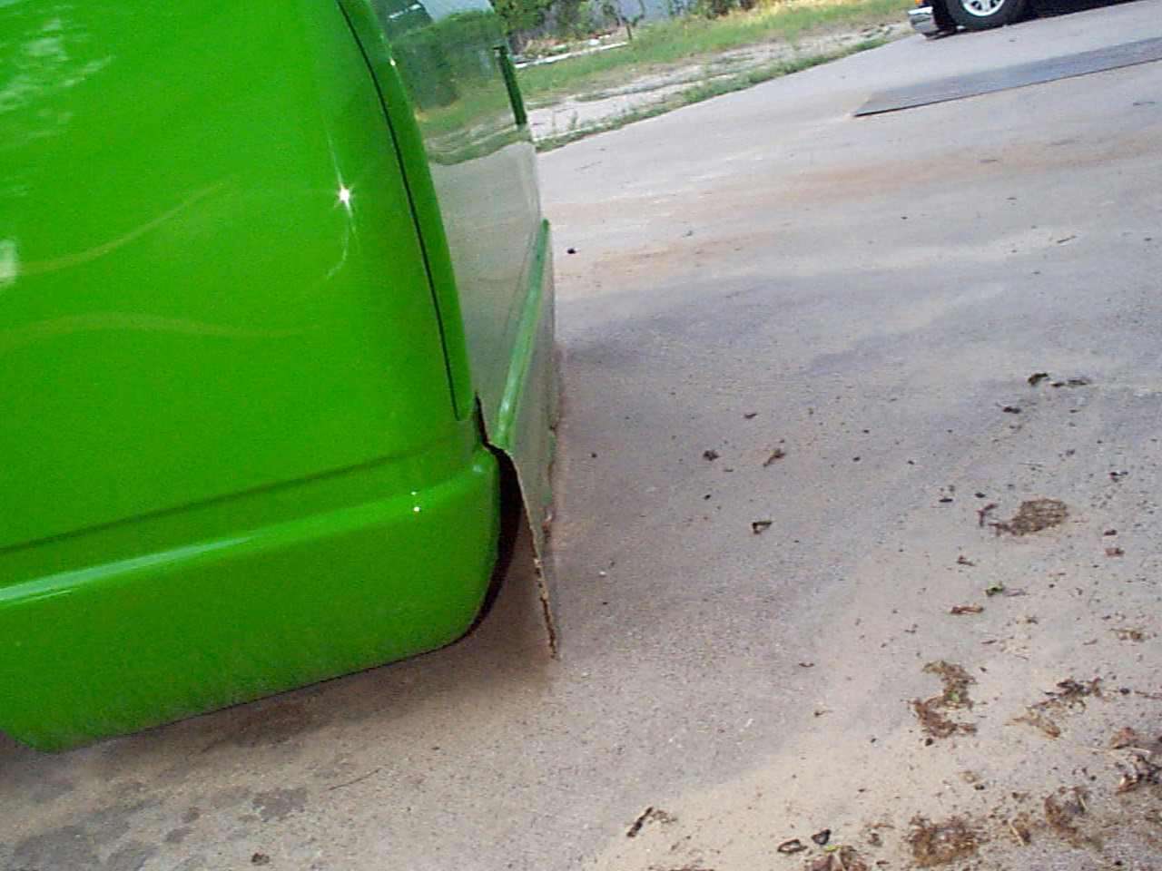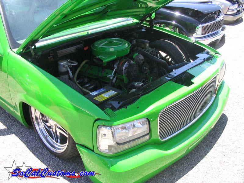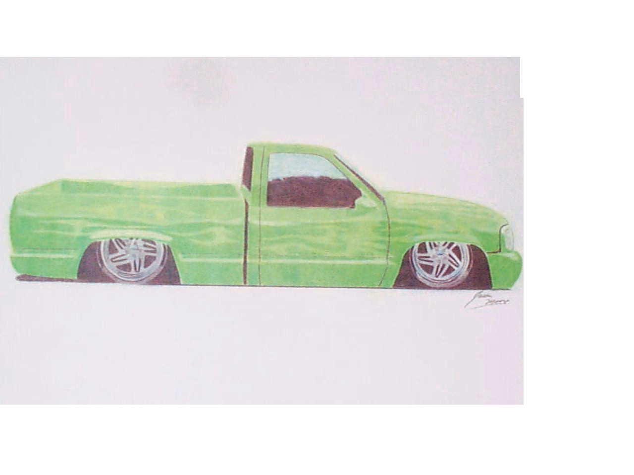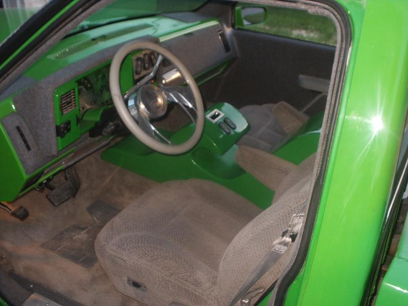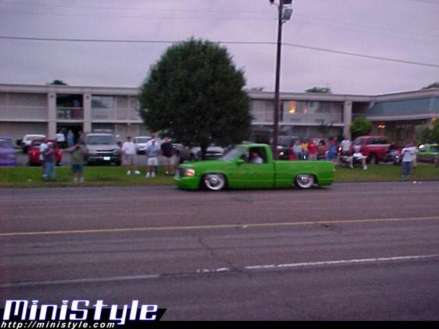 shaved handels, topbodyline, antenna, stakepost,tailgateskin, taillights, caddy taillight, bodydropped 3 1/2", bright fuckin green/ghost flames/ghosttribal on hood.