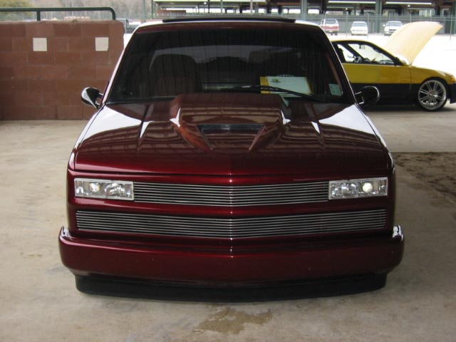 custom paint,caddy lights,shaved cargo light,stake pockets,antenna,ram airstyle hood,shaved corner lights,1/2 phantom billet grills,2 frenched antennas,molded roll pan and shaved tailgate,a big ole' 40x40 ragtop
