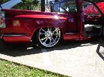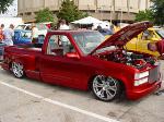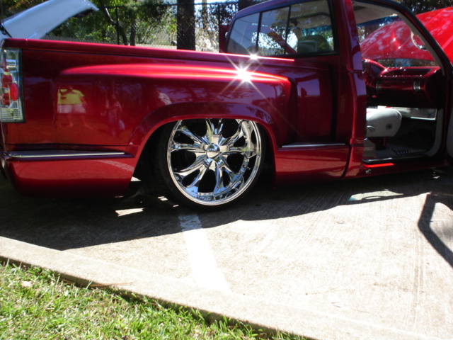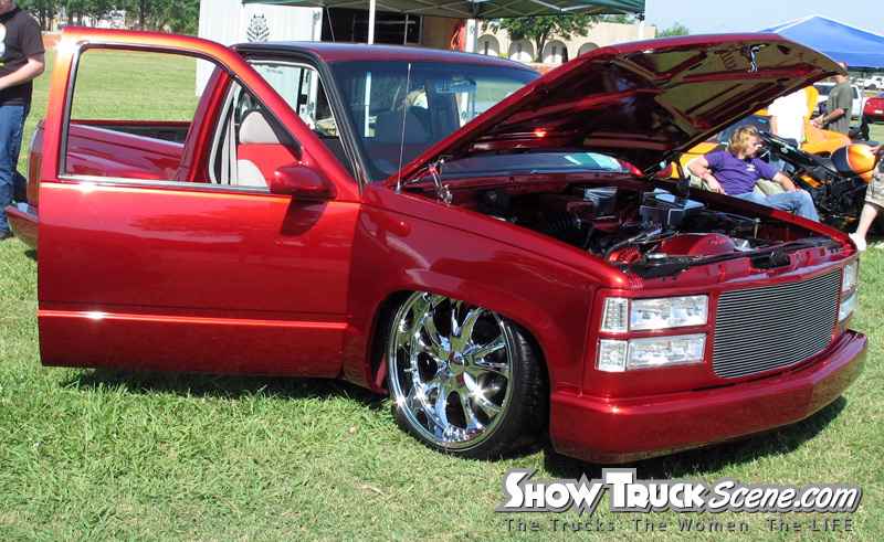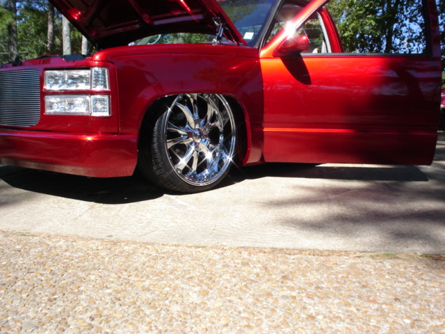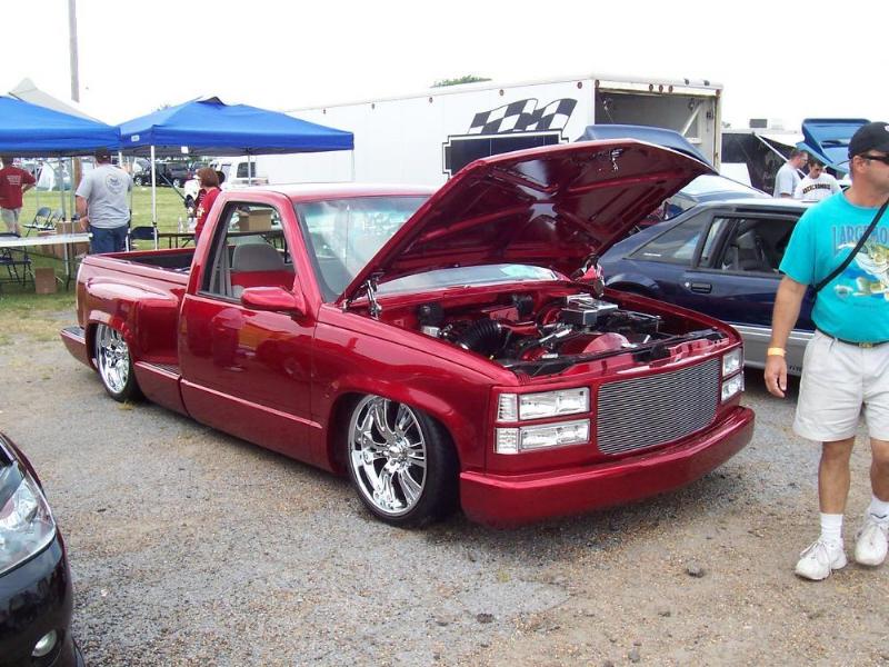 painted brandywine, shaved door handles,stack pockets, tailgate handle, third brake light, 30 bar billet gmc grille, billet step plates, billet antenna, euro taillights, corners, diamond back headlights, turn signals, and smooth bumper and rollpan