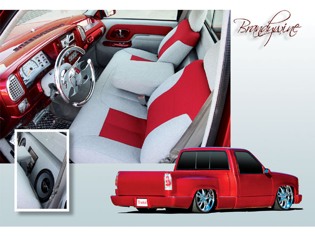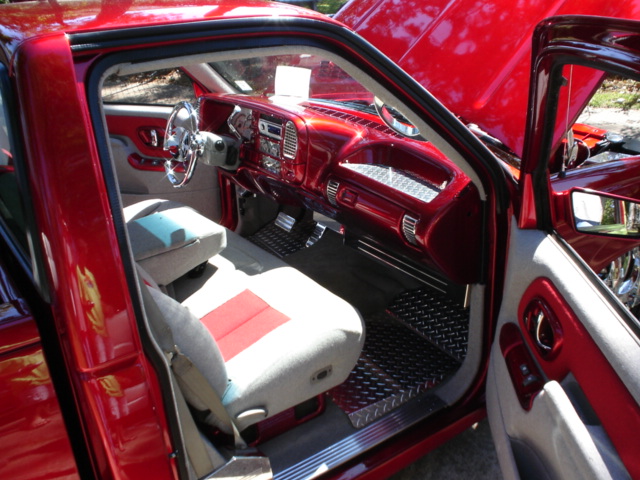 painted dash, billet a/c vents, diamond plated floormats, diamond plated cuphold cover, white face guages, light gray tweeded interior, brandywine leather also, billet steering wheel, shift handle, and grab handle