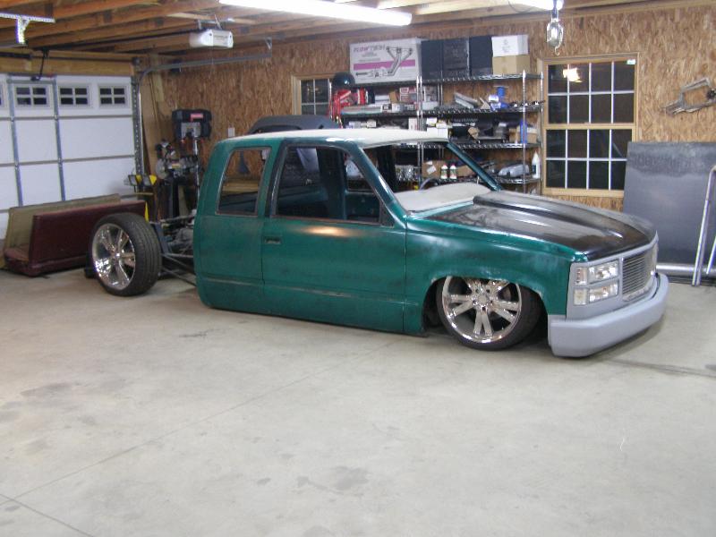 3"body drop,Shaved door handles,cab seams,third brake light,stake pockets,tailights,tailgate,Sheet metal bed,molded roll pan,reflection cowl hood, GMC grille,smooth front bumper, billet grille, euro corners and park light, projector beam head light,2001 chevrolet silverado mirrors, some round tailights and painted Planet Colors Mountain Magic Green